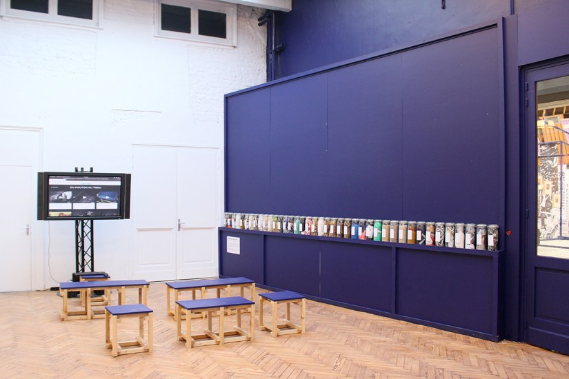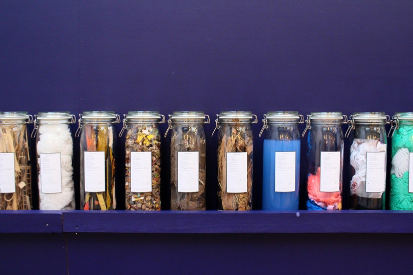 80 bocaux étiquetés et remplis des restes et déchets produits par les différentes activités présentes sur le site de La Condition Publique.