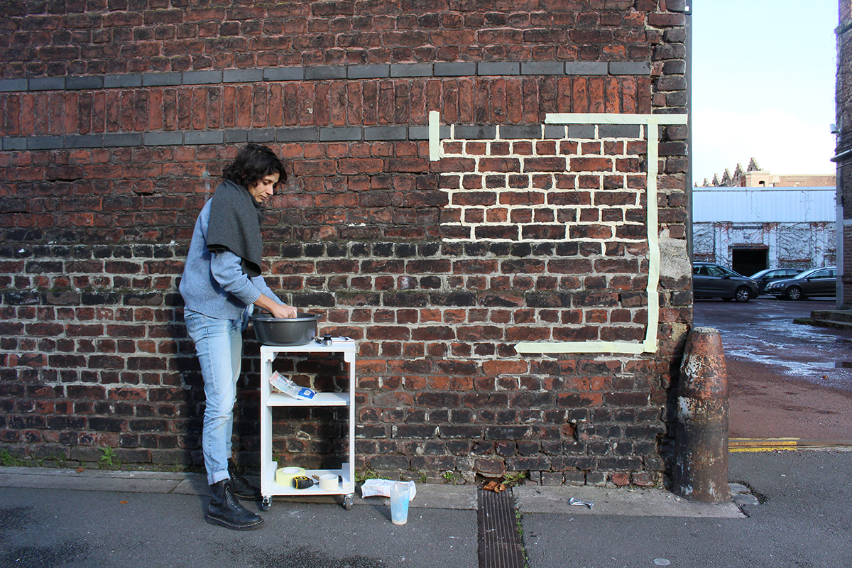 Installée au niveau du croisement entre la rue couverteet réhabilitée et la rue non-couverte et non-rénovée de La Condition Publique à Roubaix.