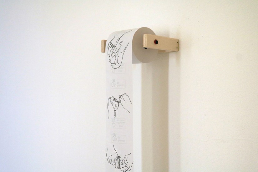 3 rouleaux de tickets de caisse, feutre ; dérouleurs en bois.