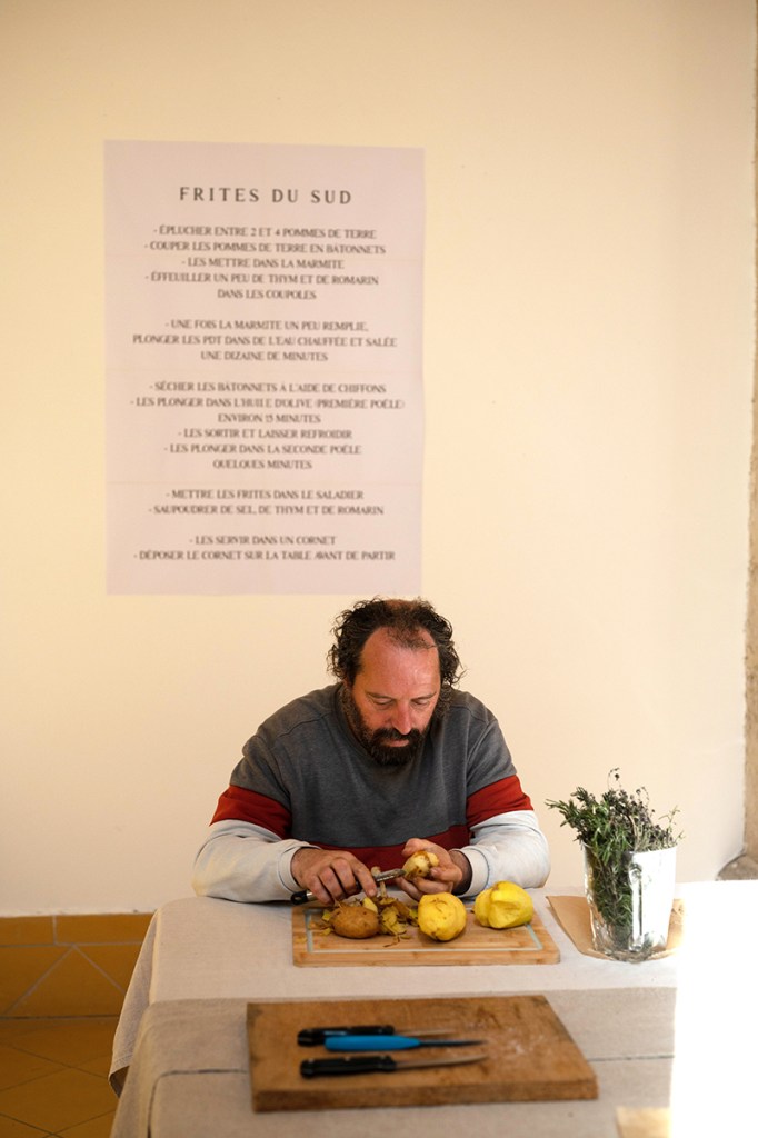 Protocole de fabrication et de dégustation de frites composées de pomme de terre et d’huile d’olive bio et locales, saupoudrées de thym et de romarin cueillis dans la Garrigue. Chaque participant.e est invité.e à trouver sa place dans le processus de réalisation et de consommation, décidant lui.elle-même de son taux de responsabilité, son équilibre entre gain et profit.