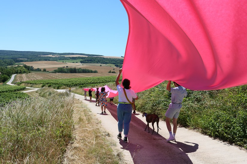 déambulation d’une heure dans les vignes environnantes du village de Crugny avec une nappe rose de 50m de long.