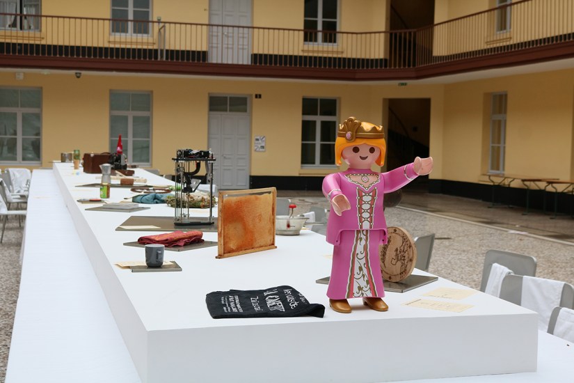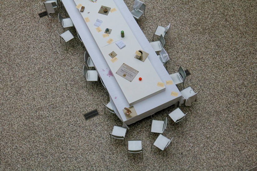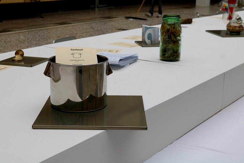 Praticables, nappe en coton, socle en bois, 80 chaises aluminium Norman Foster, 39 objets issus d’un protocole de collecte,39 fiches descriptives, 30 plateaux en aluminium.