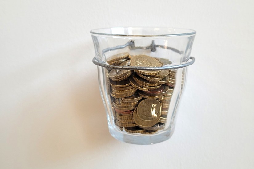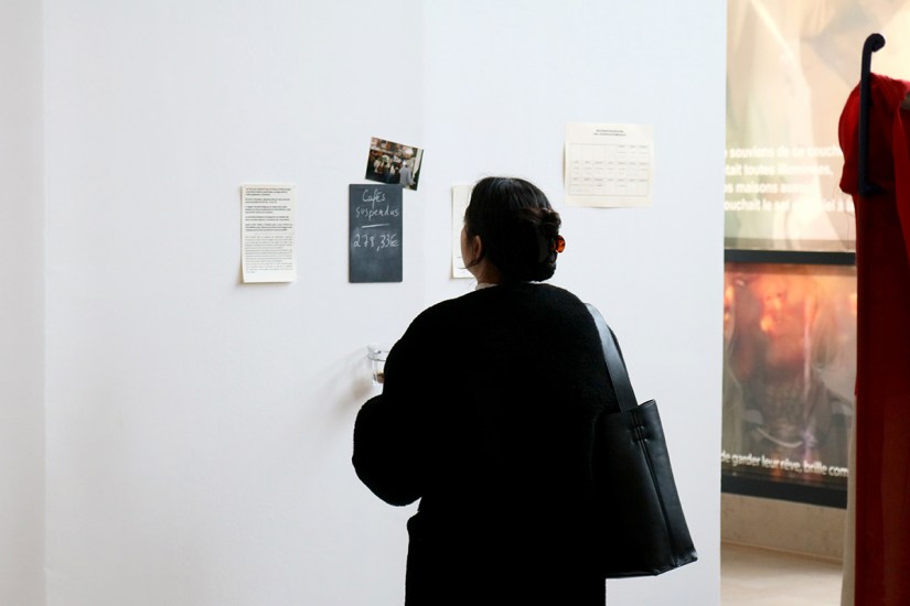 « Cafés suspendus » est un dispositif coopératif et participatif conçu lors d’ateliers avec les bénévoles du café associatif solidaire et culturel le Schmilblick à Montrouge. Il s’agit d’une installation permettant aux visteureuses de la 68ème édition du Salon de Montrouge de déposer des pièces de monnaie dans un verre. Chaque jour, le décompte et la relève est assurée par un·e membre du Schmilblick qui inscrit la somme totale récoltée sur une ardoise. L’argent est ensuite rapporté au café pour alimenter la caisse de solidarité préexistante dont chaque personne qui en fait la demande peut bénéficier afin d’accéder à un café, un sirop ou une soupe déjà réglés.