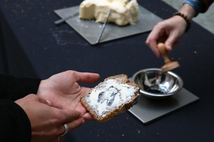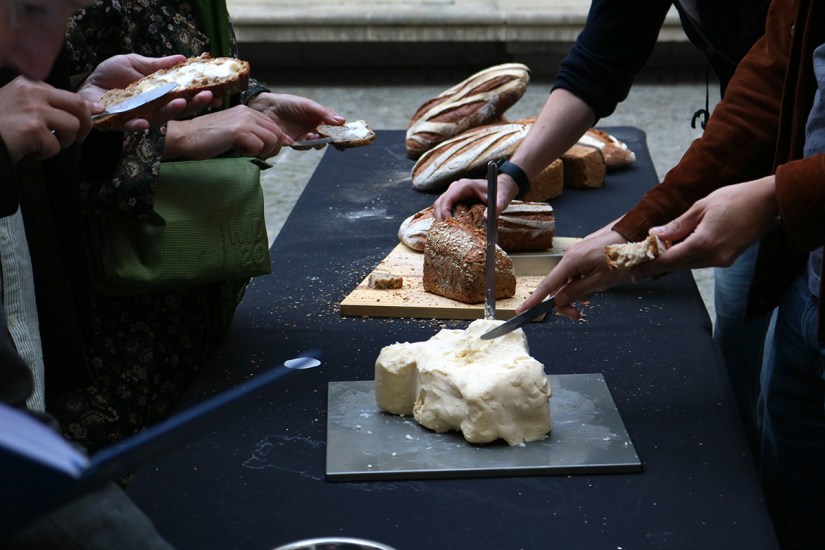 10 kg de pain du Fournil Éphémère de Montreuil, 2 kg de beurre fermier, encre alimentaire au charbon, 5 tampons représentant des pis de vaches réalisés dans le cadre du projet La fête du beurre