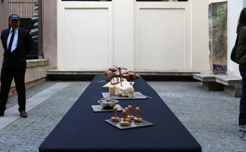 10 kg de pain du Fournil Éphémère de Montreuil, 2 kg de beurre fermier, encre alimentaire au charbon, 5 tampons représentant des pis de vaches réalisés dans le cadre du projet La fête du beurre