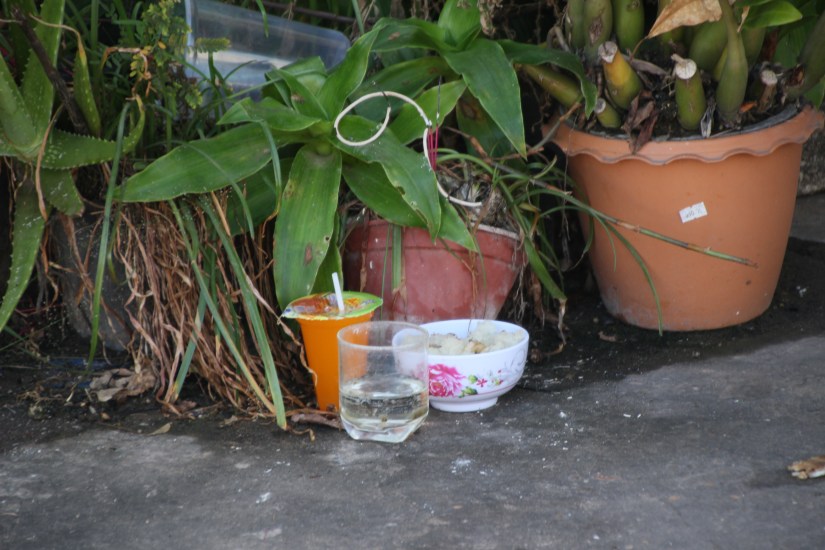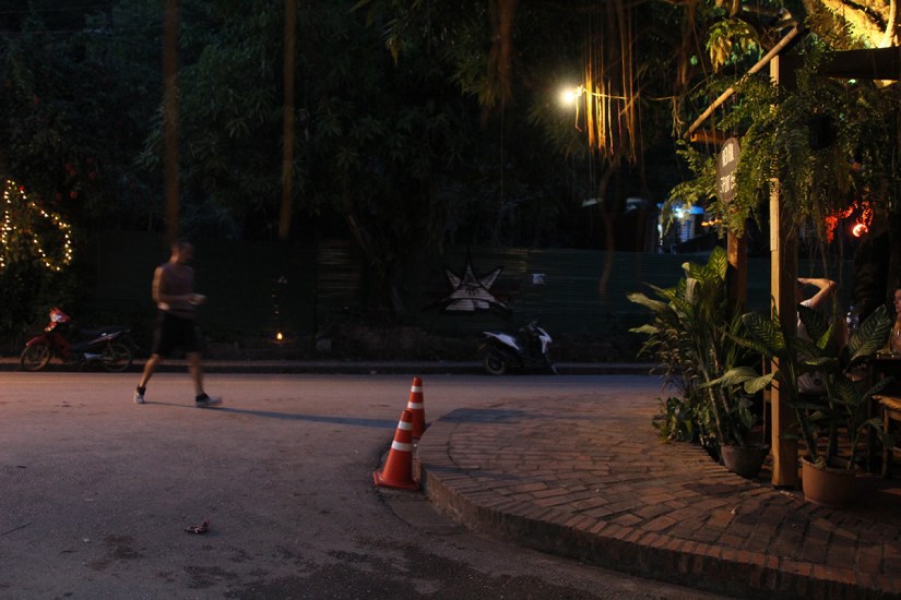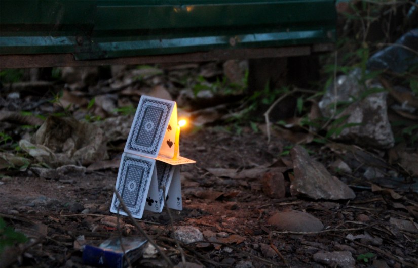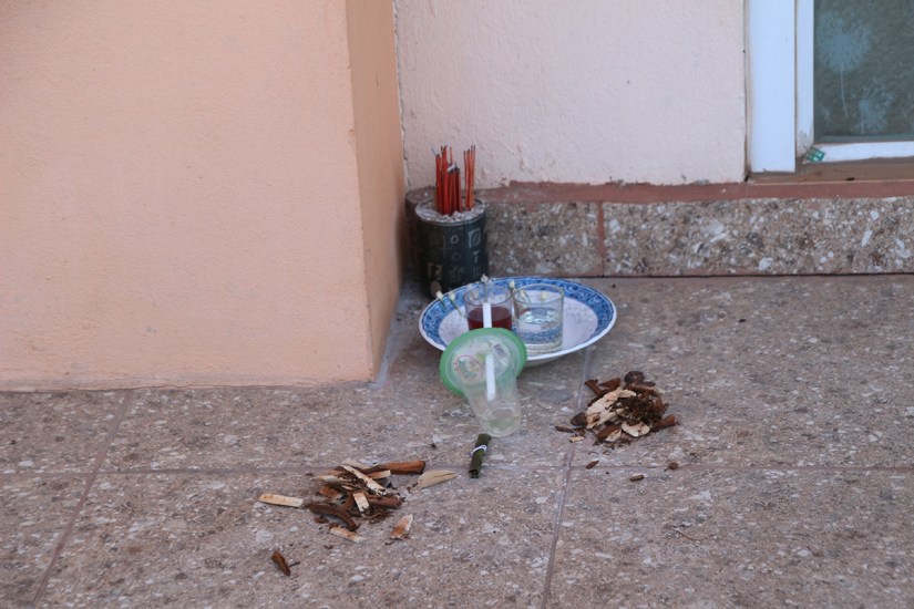 Micro-installation sur un trottoir de Luang Prabang (cartes à jouer, bougies de prière).