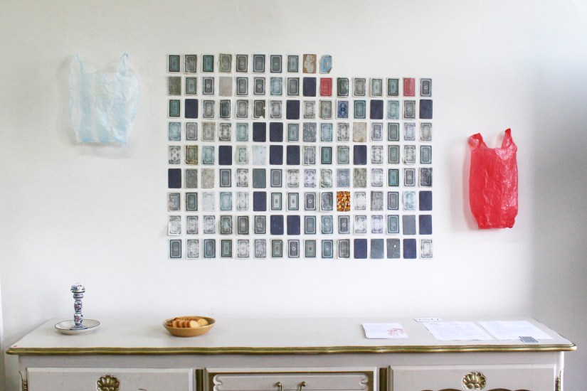 Installation de 152 cartes à jouer récupérées par terre dans différents lieux au Laos et de deux sacs plastiques laotiens, exposée à la ressourcerie de Beaurainville (62) en janvier 2019.